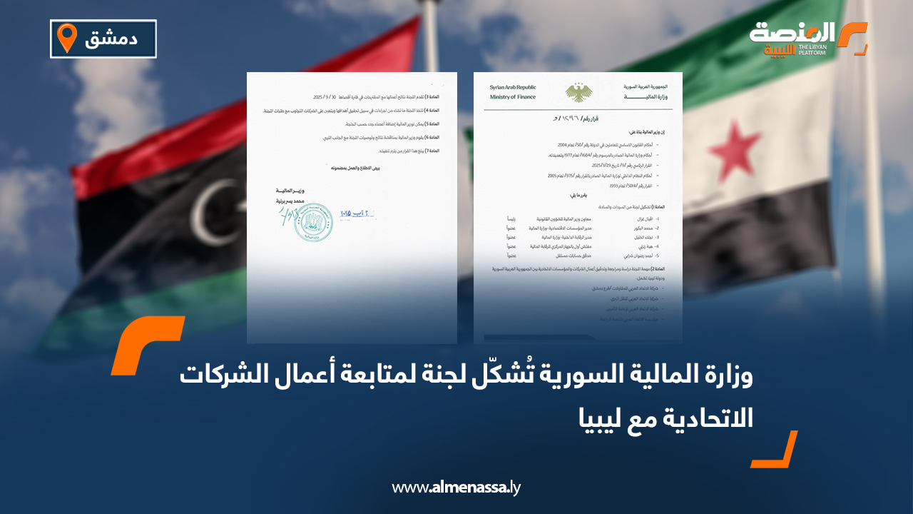 اقتصاد وزارة المالية السورية تُشكّل لجنة لمتابعة أعمال الشركات الاتحادية مع ليبيا اقرأ المزيد » 2025-08-04