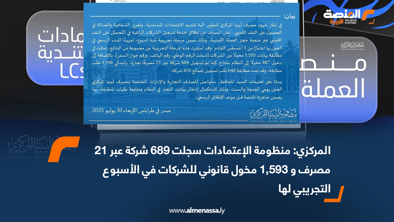 اقتصاد المركزي: منظومة الاعتمادات سجلت 689 شركة عبر 21 مصرف و 1,593 مخول قانوني للشركات في الأسبوع التجريبي لها اقرأ المزيد » 2025-07-30