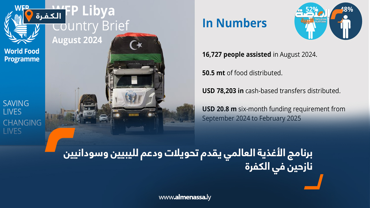 تقارير برنامج الأغذية العالمي يقدم تحويلات ودعم لليبيين وسودانيين نازحين في الكفرة اقرأ المزيد » 2024-09-26