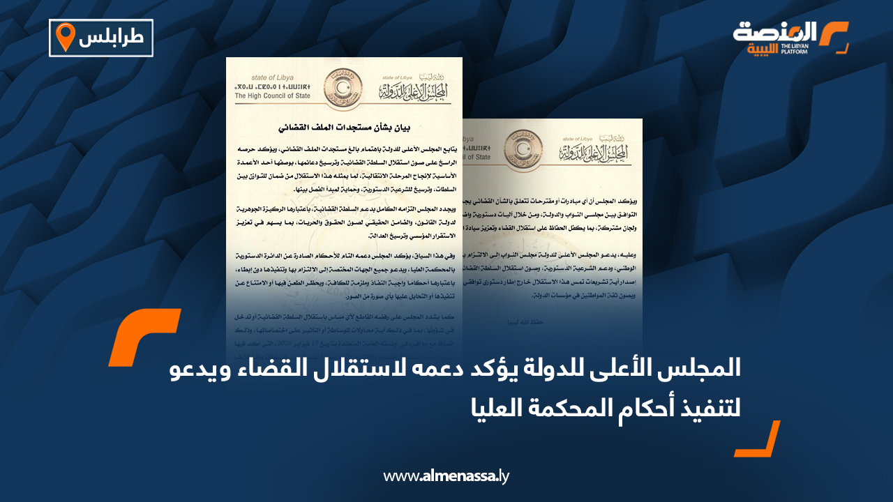 سياسة المجلس الأعلى للدولة يؤكد دعمه لاستقلال القضاء ويدعو لتنفيذ أحكام المحكمة العليا اقرأ المزيد » 2026-03-18