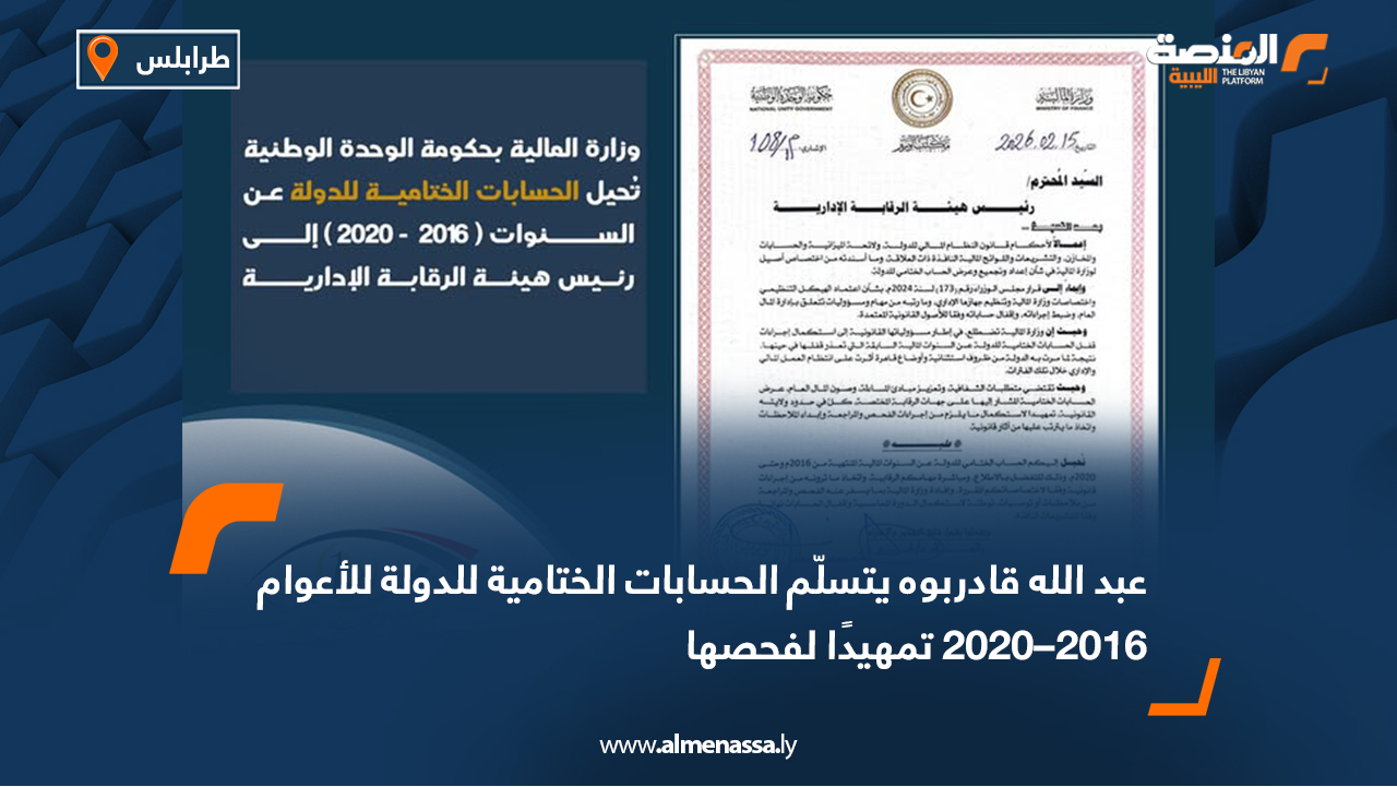 سياسة محلية عبد الله قادربوه يتسلّم الحسابات الختامية للدولة للأعوام 2016–2020 تمهيدًا لفحصها اقرأ المزيد » 2026-02-25