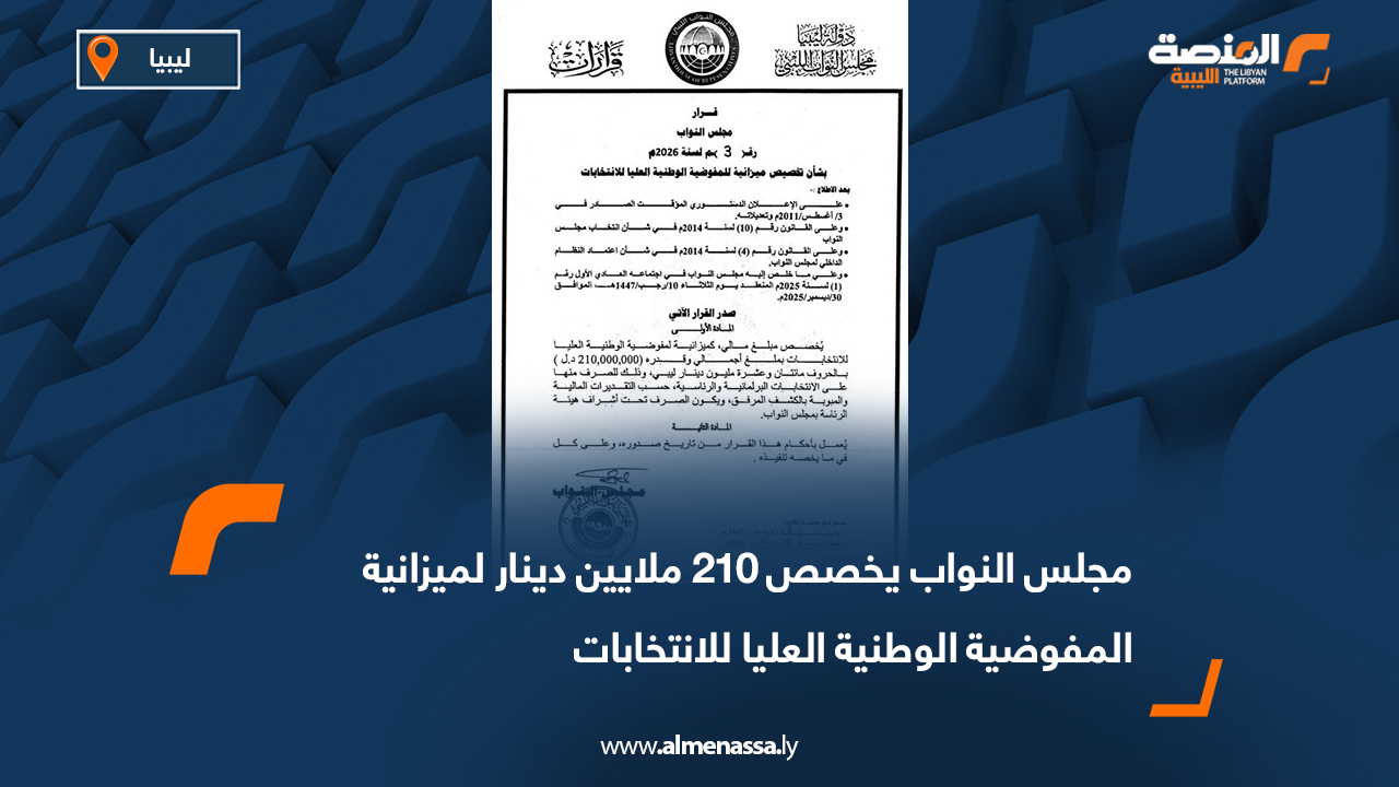 سياسة محلية مجلس النواب يخصص 210 ملايين دينار لميزانية المفوضية الوطنية العليا للانتخابات اقرأ المزيد » 2026-01-28