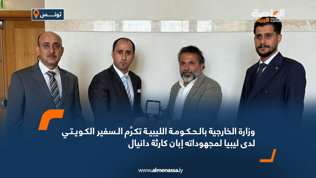 سياسة وزارة الخارجية بالحكومة الليبية تكرِّم السفير الكويتي لدى ليبيا لمجهوداته إبان كارثة دانيال اقرأ المزيد » 2024-05-19