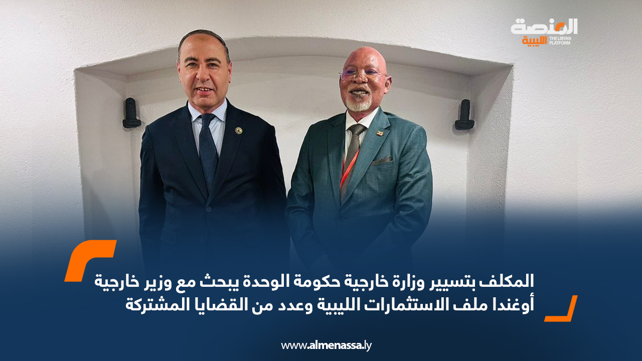 سياسة المكلف بتسيير وزارة خارجية حكومة الوحدة يبحث مع وزير خارجية أوغندا ملف الاستثمارات الليبية وعدد من القضايا المشتركة اقرأ المزيد » 2024-05-05