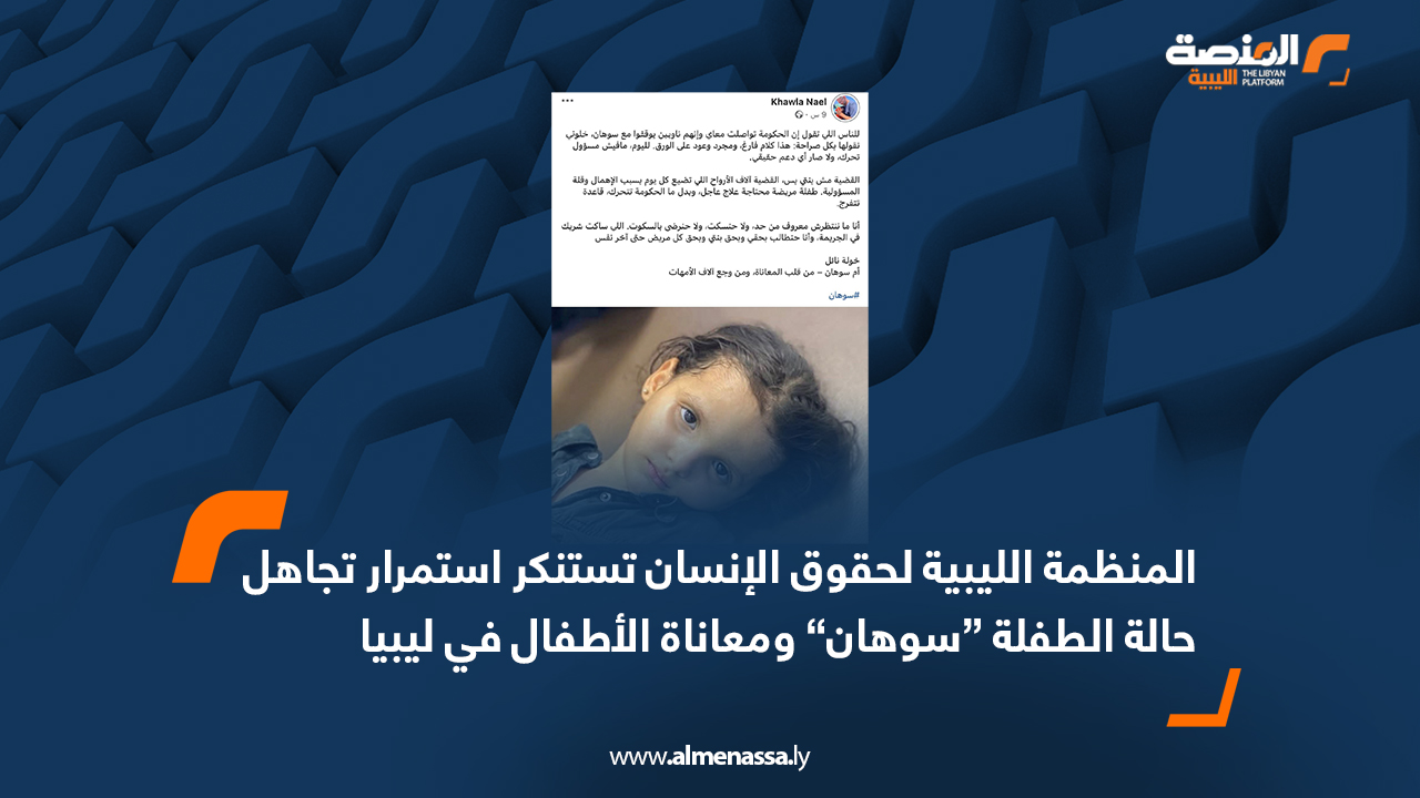 صحة المنظمة الليبية لحقوق الإنسان تستنكر استمرار تجاهل حالة الطفلة “سوهان” ومعاناة الأطفال في ليبيا اقرأ المزيد » 2025-06-29