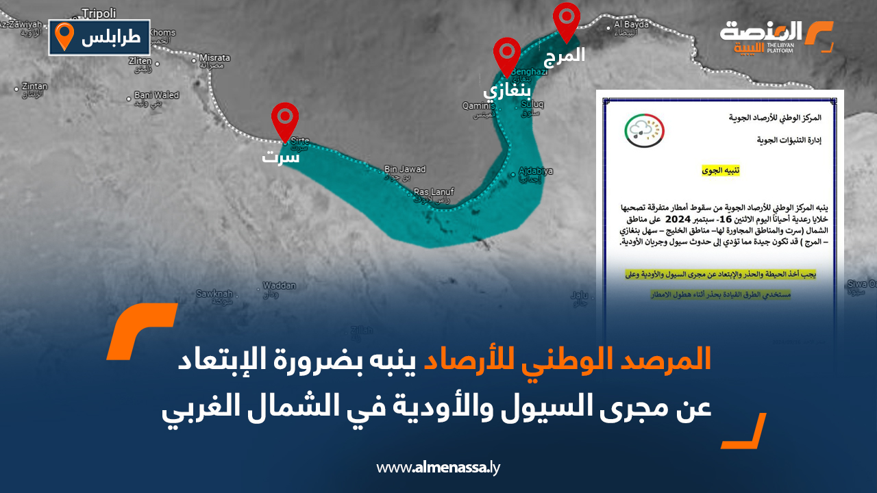 بيئة المرصد الوطني ينبه بضرورة الابتعاد عن مجرى السيول والأودية في الشمال الغربي اقرأ المزيد » 2024-09-16
