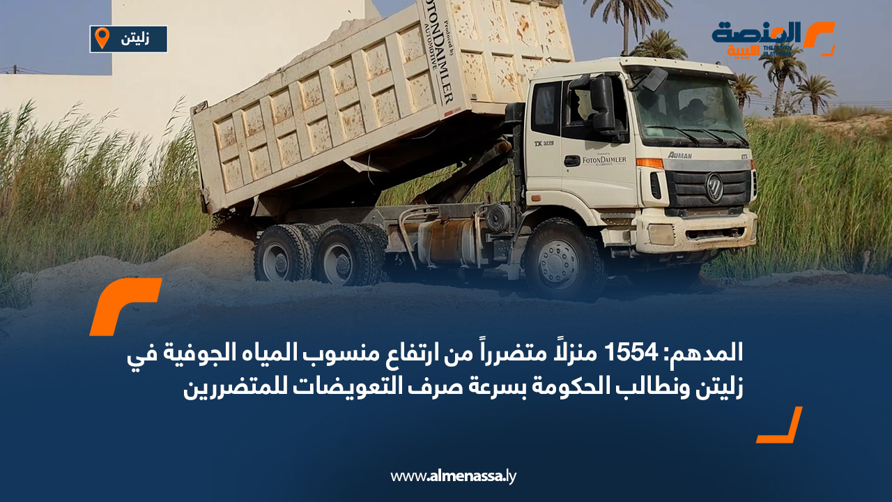 بيئة المدهم: 1554 منزلاً متضرراً من ارتفاع منسوب المياه الجوفية في زليتن ونطالب الحكومة بسرعة صرف التعويضات للمتضررين اقرأ المزيد » 2024-06-14