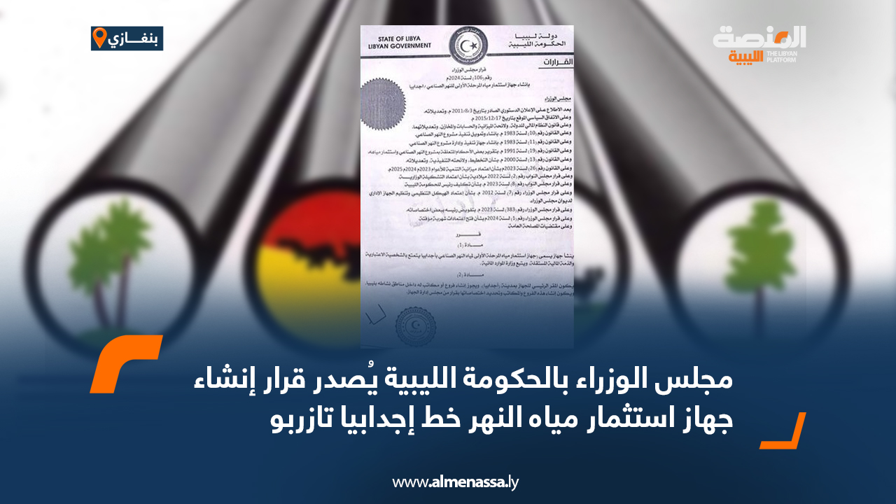 بيئة مجلس الوزراء بالحكومة الليبية يُصدر قرار إنشاء جهاز استثمار مياه النهر خط إجدابيا تازربو اقرأ المزيد » 2024-05-14