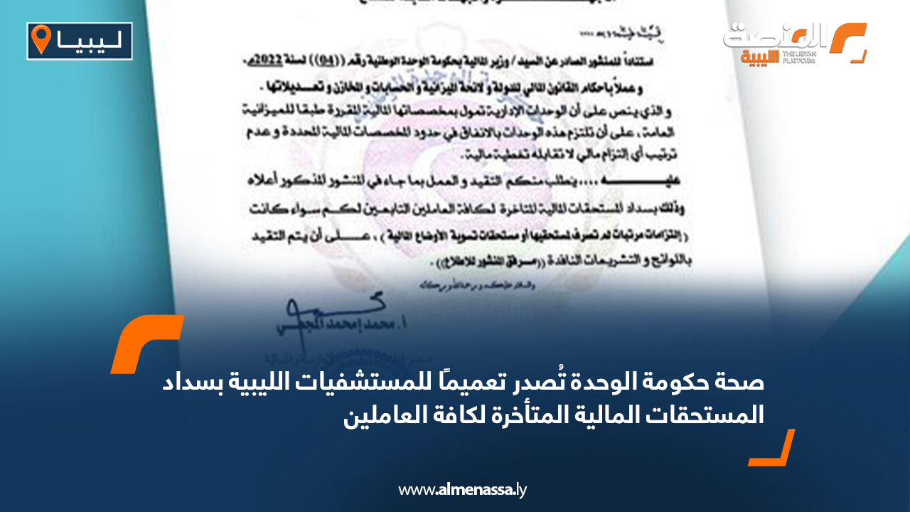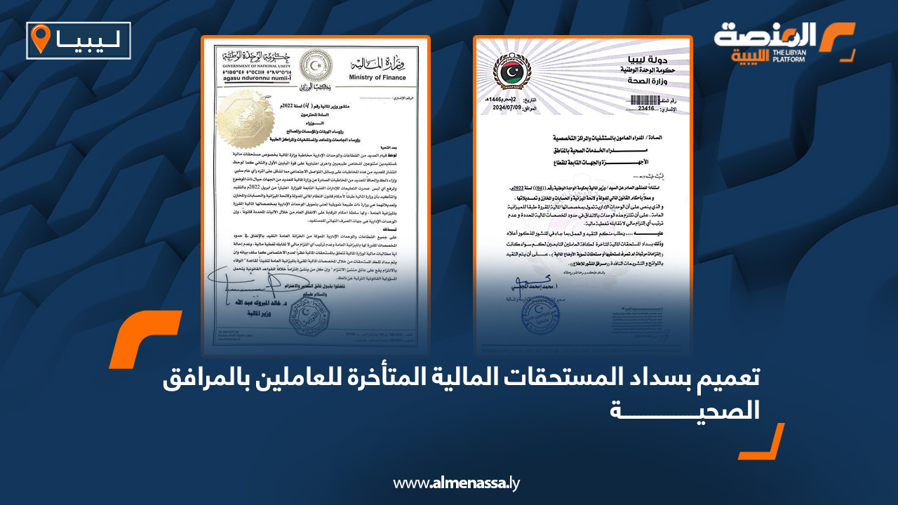 صحة صحة حكومة الوحدة تُصدر تعميمًا للمستشفيات الليبية بسداد المستحقات المالية المتأخرة لكافة العاملين اقرأ المزيد » 2024-07-10