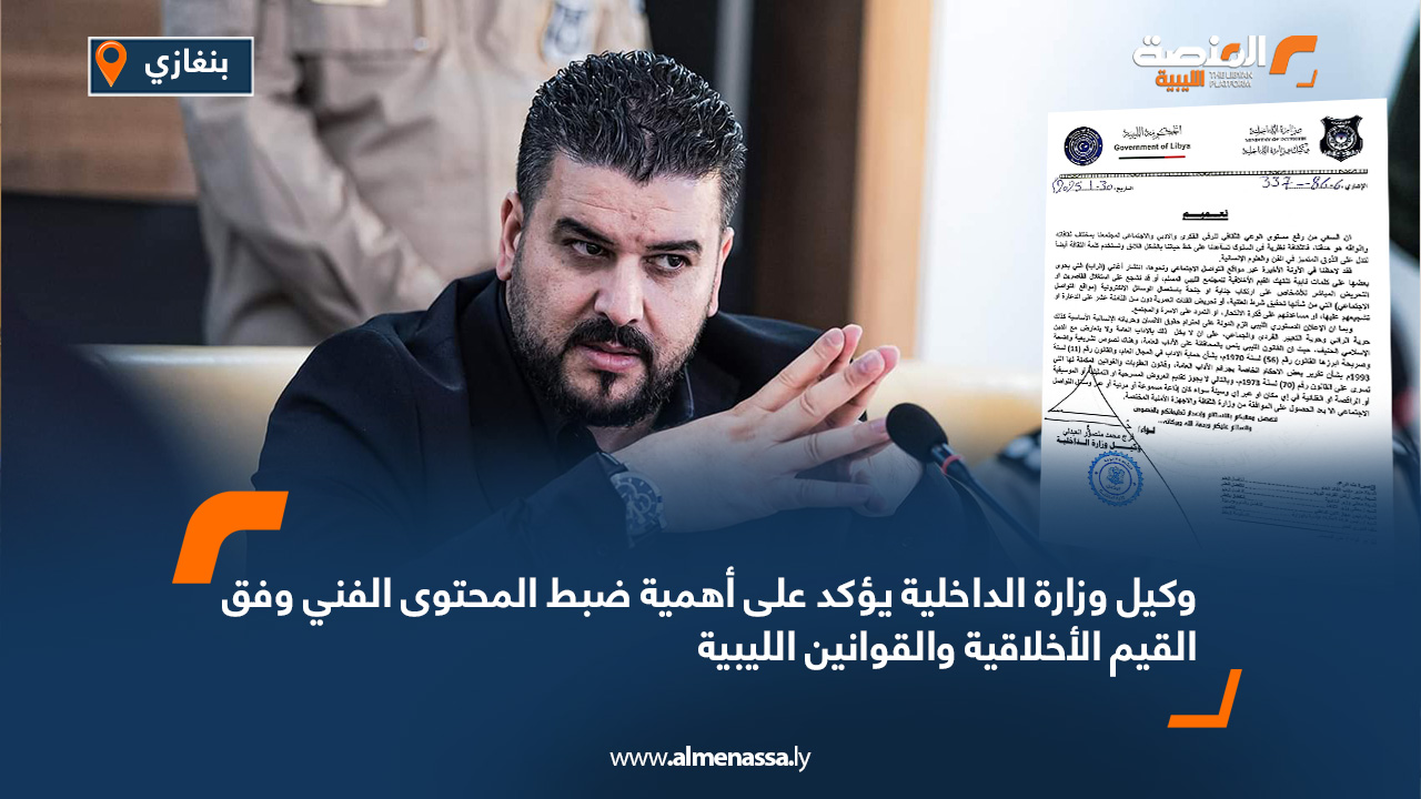 فنون وكيل وزارة الداخلية يؤكد على أهمية ضبط المحتوى الفني وفق القيم الأخلاقية والقوانين الليبية اقرأ المزيد » 2025-01-30