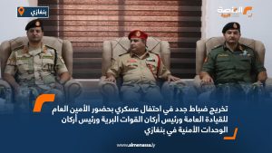 أمني وعسكري تخريج ضباط جدد في احتفال عسكري بحضور الأمين العام للقيادة العامة ورئيس أركان القوات البرية ورئيس أركان الوحدات الأمنية في بنغازي اقرأ المزيد » 2024-10-03