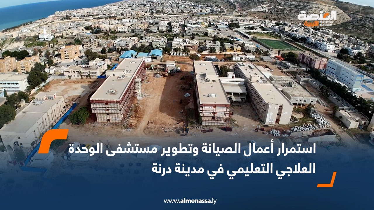 تستمر أعمال الصيانة والتطوير لمستشفى الوحدة العلاجي التعليمي في مدينة درنة ليكون جاهزاً لتقديم الخدمات الطبية والعلاجية للمواطنين في مدينة درنة وما جاورها ليصبح أسمه مركز درنة الطبي.
