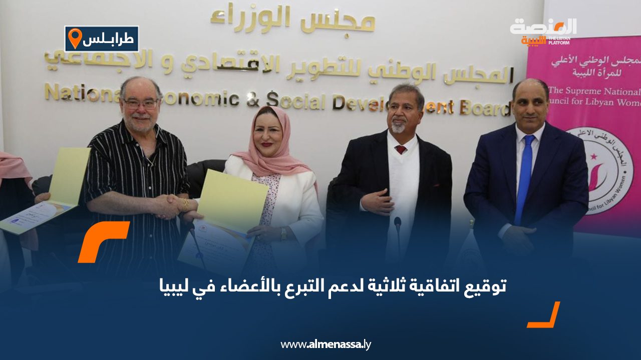 أعلنت المنظمة الوطنية لدعم التبرع بالأعضاء برئاسة محمود ميلاد أبودبوس عن توقيع اتفاقية ثلاثية لدعم التبرع بالأعضاء في ليبيا مع المجلس الوطني الأعلى للمرأة الليبية، برئاسة الدكتورة ليلى محمد سويسي، والهيئة الوطنية العامة لزراعة الأعضاء والأنسجة والخلايا، برئاسة رائد زراعة الأعضاء في ليبيا، البروفيسور احتيوش فرج احتيوش، وبمشاركة البروفيسور عبد الحفيظ الشيباني، رئيس الجمعية الليبية لطب وزراعة الكلى.