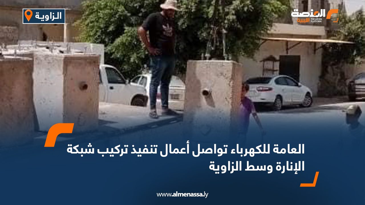 أعلنت الشركة العامة للكهرباء مواصلة أعمال تنفيذ المسار الثاني لتركيب شبكة الإنارة العامة بداية من كوربة الضمان إلى جزيرة منطقة عوزة بالقرب من وسط مدينة الزاوية .