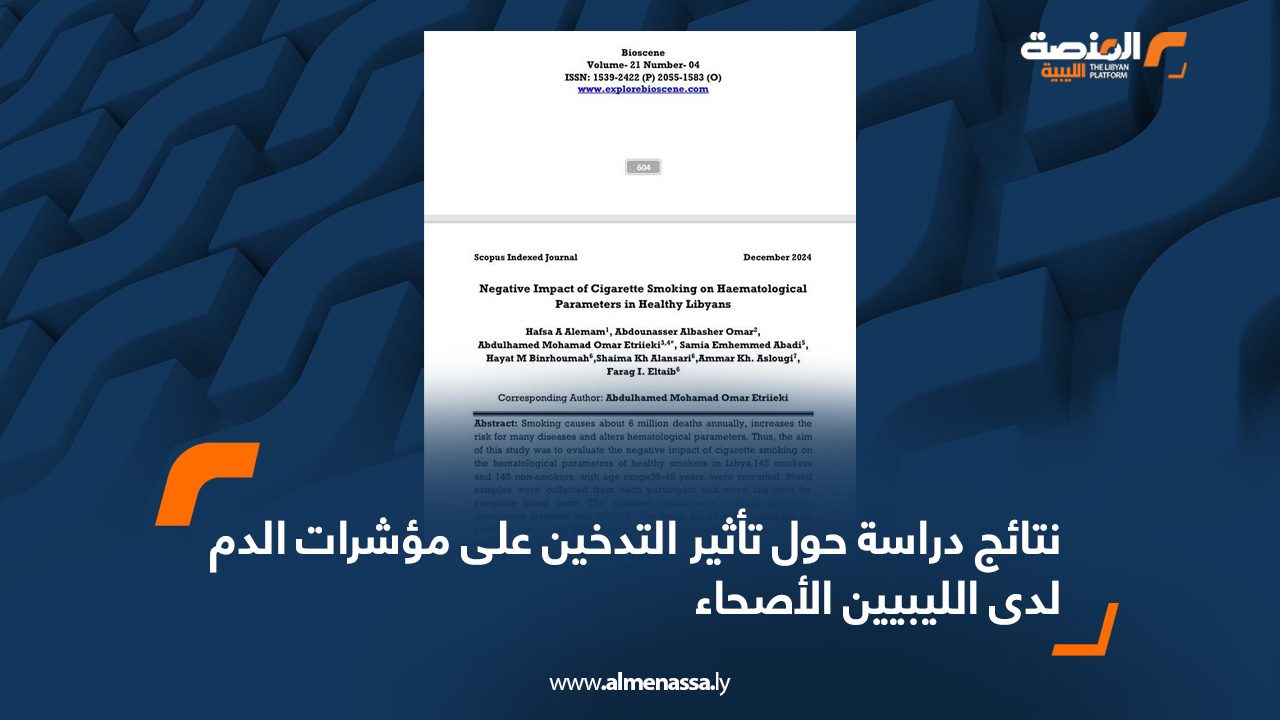 نشرت الدكتورة حفصة الإمام وفريقها البحثي دراسة علمية بعنوان: التأثير السلبي لتدخين السجائر على مؤشرات الدم لدى الليبيين الأصحاء، في إحدى المجلات المصنفة ضمن قاعدة بيانات Scopus.