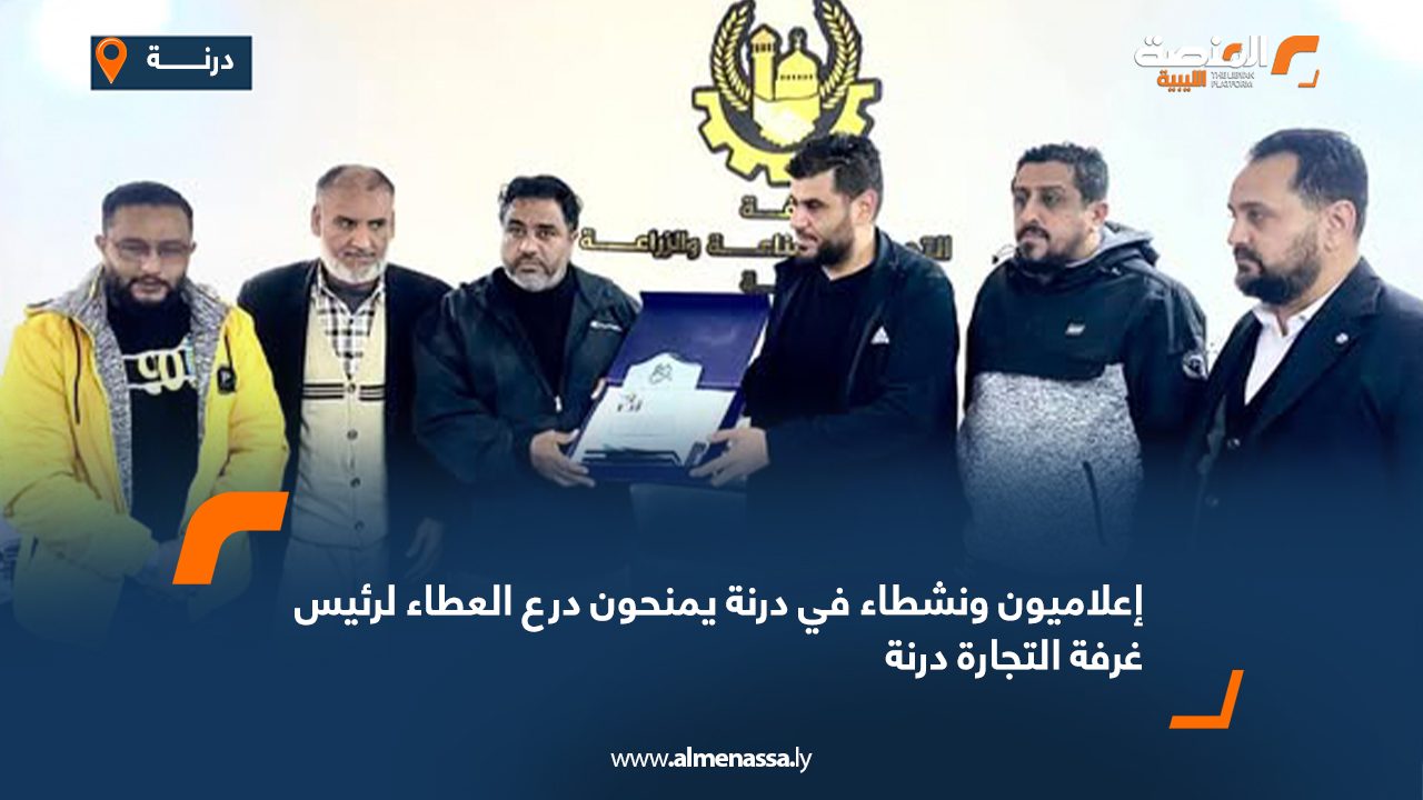 أهدى عدد من الإعلاميين والنشطاء في مدينة درنة درع العطاء والتميز، لرئيس مجلس إدارة غرفة التجارة والصناعة والزراعة درنة عبدالحميد الحبيب.