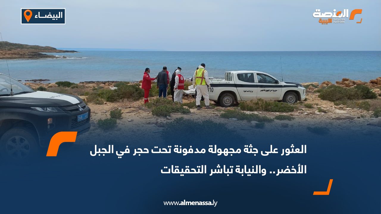 أعلنت مديرية أمن الجبل الأخضر العثور على جثة مجهولة الهوية مدفونة جزئياً تحت حجر على شاطئ البحر في منطقة شق عبد الرازق، وذلك عقب بلاغ تقدم به أحد المواطنين إلى مركز شرطة الحمامة.