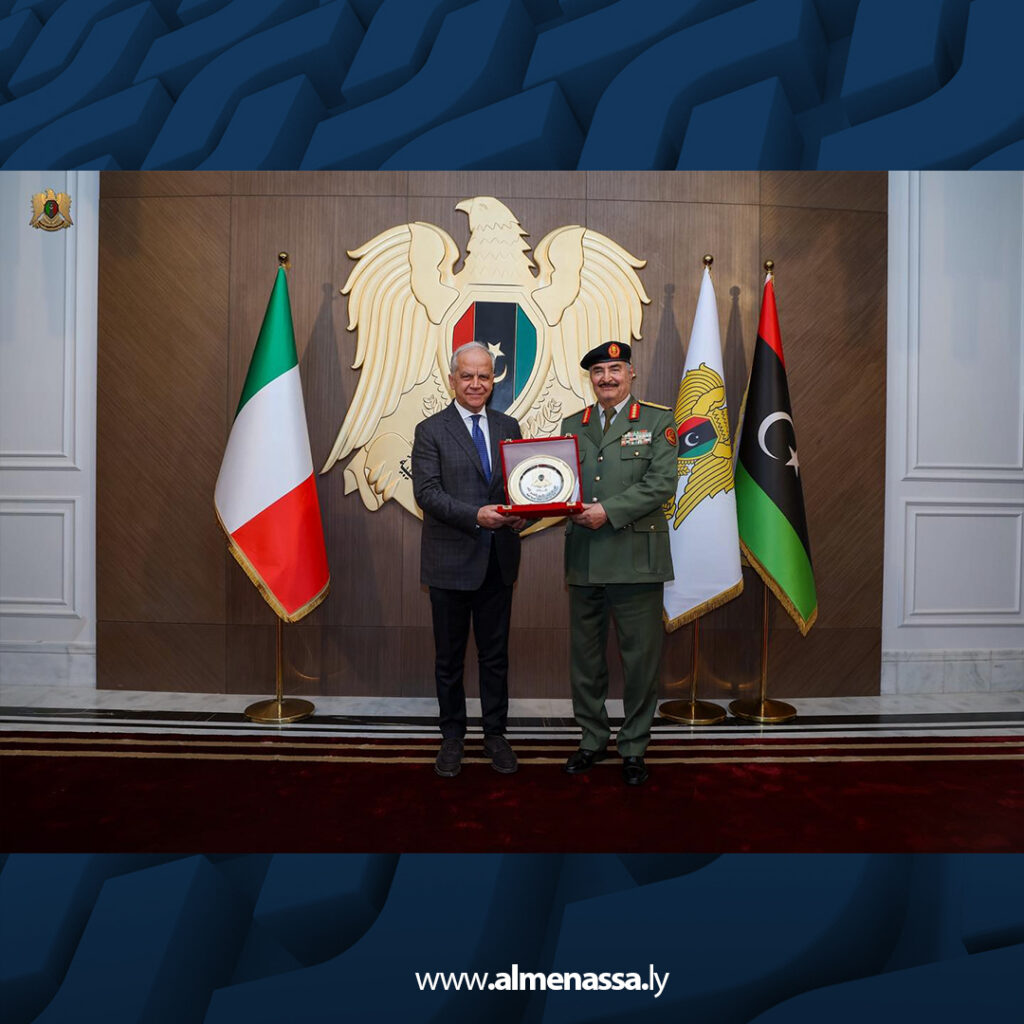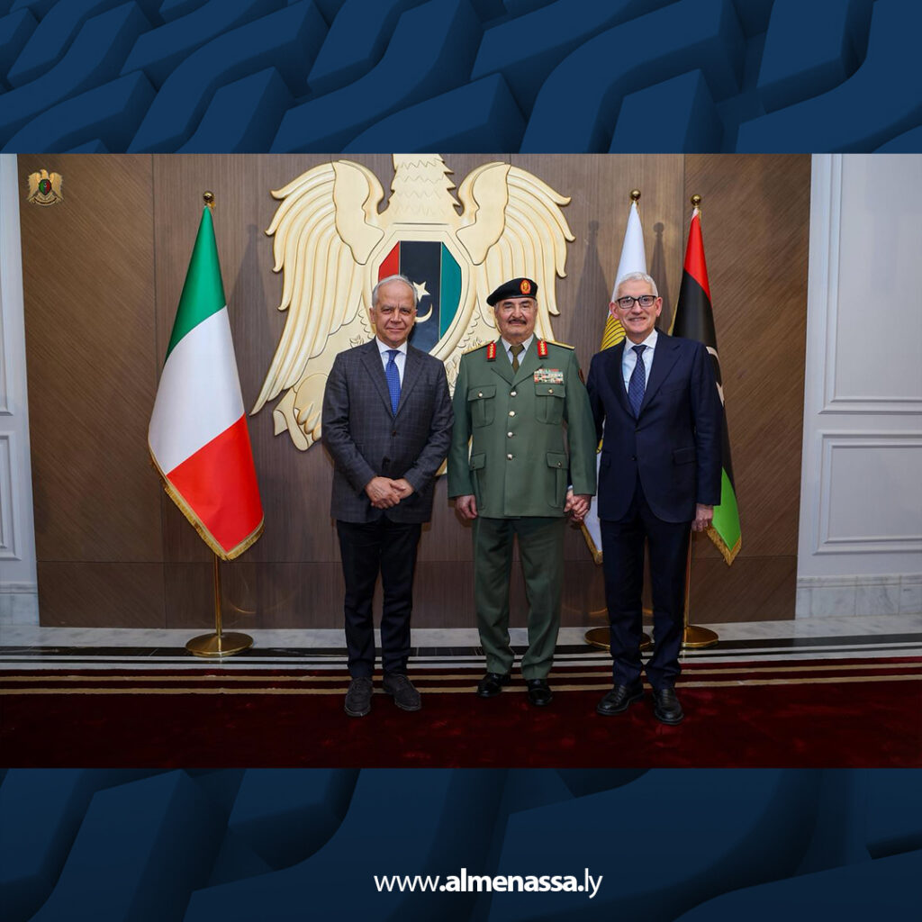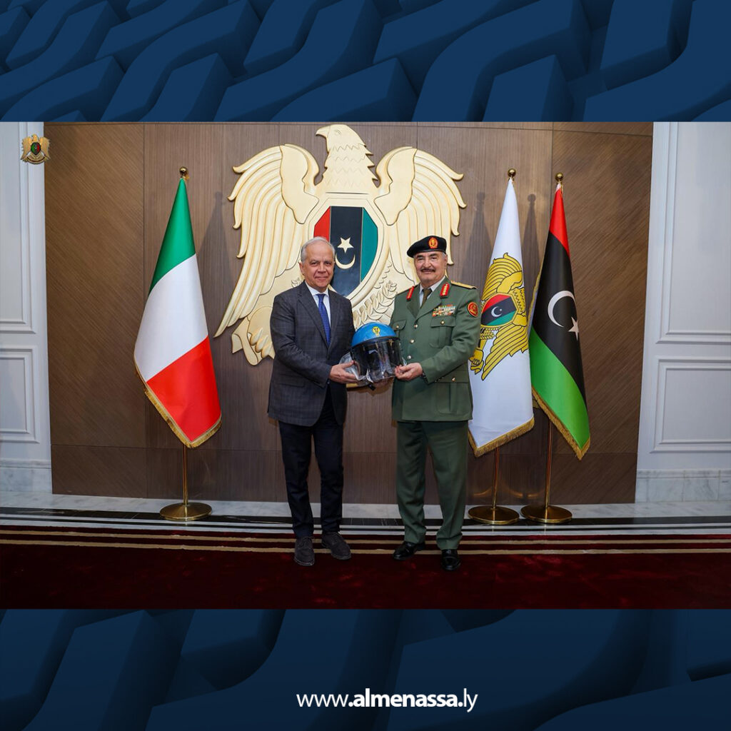 استقبل القائد العام للقوات المسلحة، المشير “خليفة حفتر”، وفدا رفيع المستوى من الجمهورية الإيطالية برئاسة وزير الداخلية الإيطالي “ماتيو بيانتيدوسي”، ورئيس جهاز المخابرات الإيطالي، “جيوفاني كارفيلي”، وذلك في مكتبه بمقر القيادة العامة – بنغازي.